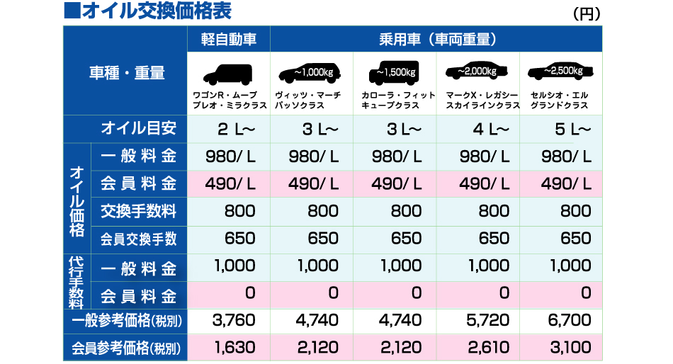 ※車のグレード等により、オイル料が異なるため、価格がことなる場合があります。